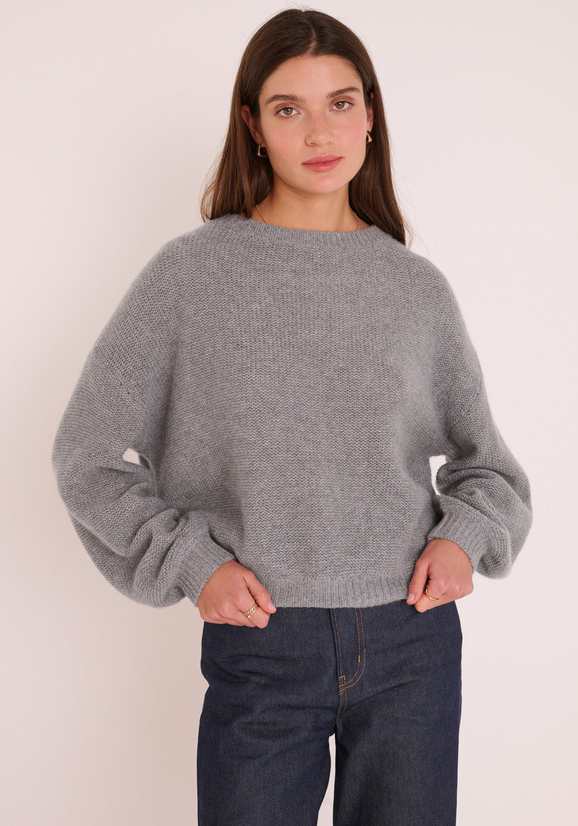 Ein beiger Kaschmir Strickpullover von Princess Goes Hollywood mit langen Ärmeln, Rundhalsausschnitt und entspannter, leicht kastiger Passform. Das gestrickte Oberteil hat gerippte Bündchen, Saum und Ausschnitt und ist vor weißem Hintergrund zu sehen.