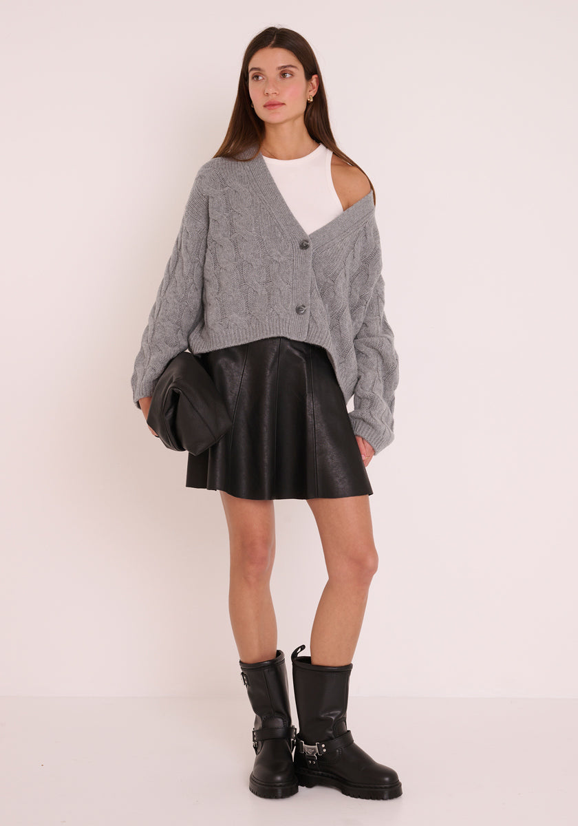 Frau trägt schwarzen Lederrock und weissen Snoopy-Wollpullover mit handgestrickter Intarsie, liegt entspannt auf Asphalt mit gelben Linien, modern und stilvoll inszeniert.