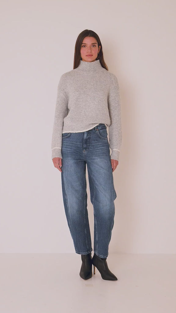 A fluffy chunky knit sweater with a stand-up collar and long sleeves with dropped shoulders. Contrasting cuffs and hem. Ribbed detailing at the neckline, cuffs, and hem.