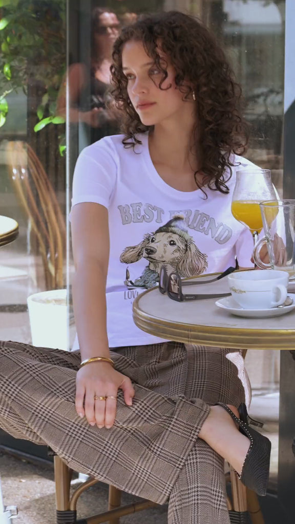 100% cotton T-shirt with a dachshund print. Round neck and short sleeves. Rhinestone embellishment. "Best Friend" lettering.