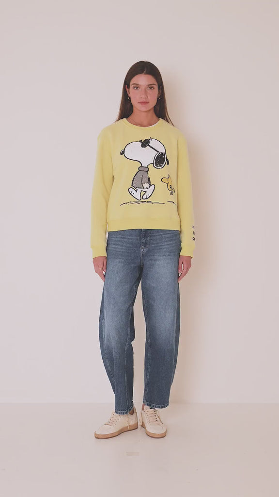 Sweat-shirt en mélange de coton. Col rond et manches longues à épaules tombantes. Taille et ourlet élastiqués. Imprimé Snoopy et Woodstock orné de strass. Inscription « Never too cool » sur la manche gauche. Col, poignets et ourlet côtelés.