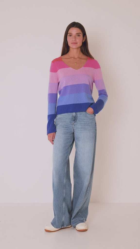 Gestreifter Feinstrickpullover aus 100% Kaschmir mit V-Ausschnitt und langen Ärmeln.
