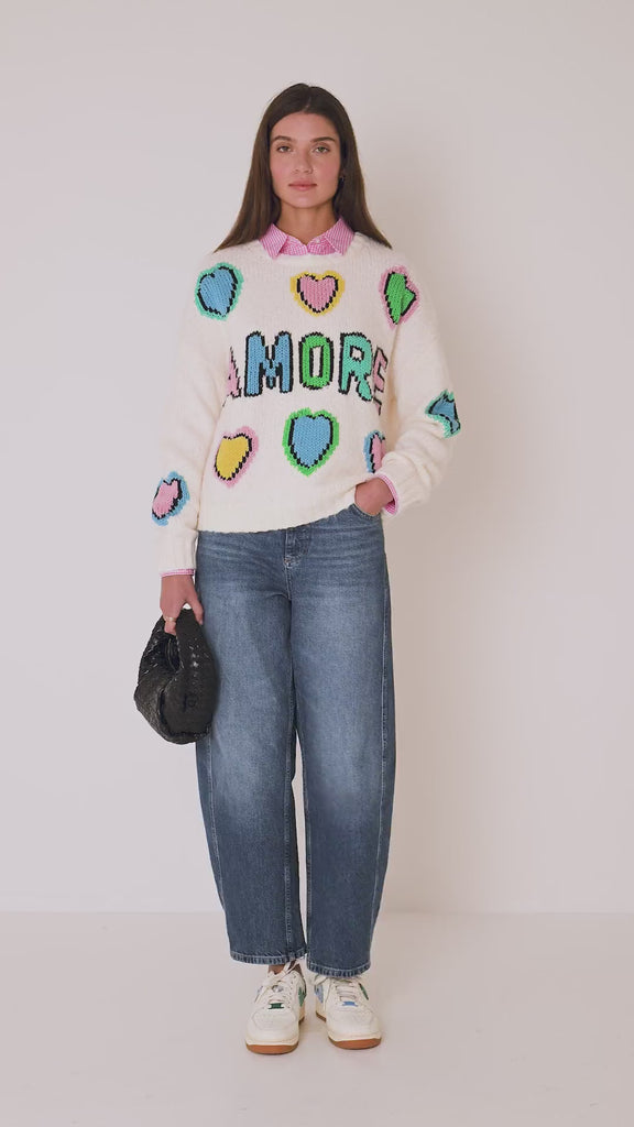 Grobstrickpullover aus Wollmix mit handgestricktem "Amore" - Schriftzug und Herzen. Rundhalsausschnitt und lange Ärmel mit überschnittenen Schultern. Rippungen am Ausschnitt, Bündchen und Saum.