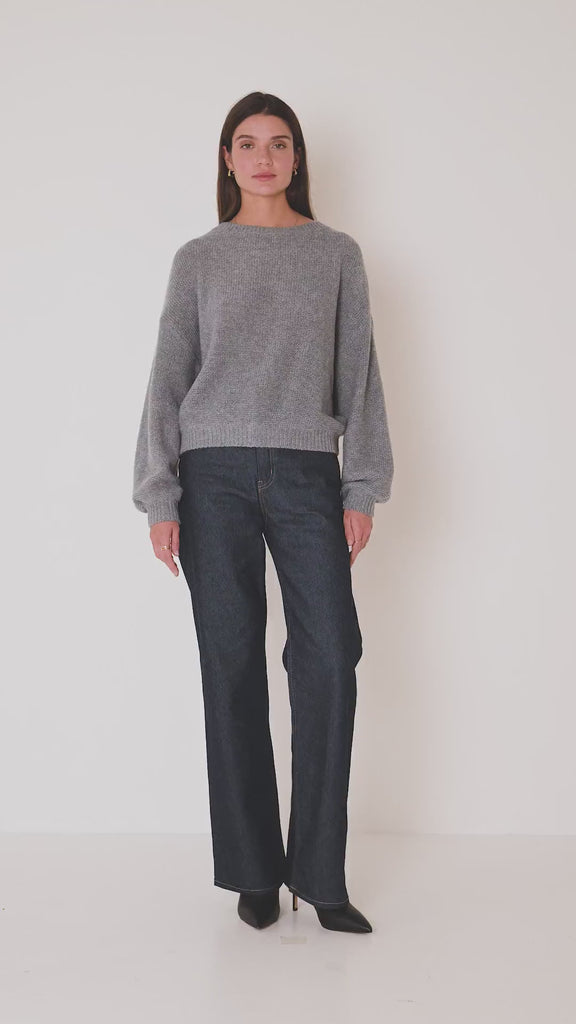 Strickpullover aus 100% Kaschmir mit Rundhalsausschnitt und langen, leicht ballonförmigen Ärmeln. Überschnittene Schultern. Rippungen am Ausschnitt, Bündchen und Saum. Links gestrickt.