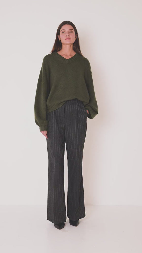 Strickpullover aus 100% Kaschmir mit V-Ausschnitt und langen, leicht ballonförmigen Ärmeln. Überschnittene Schultern. Rippungen am Ausschnitt, Bündchen und Saum.