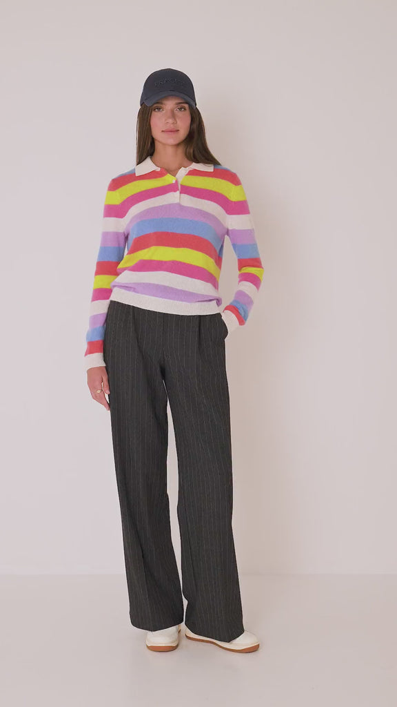 Gestreifter Feinstrickpullover aus 100% Kaschmir mit Polokragen, Knöpfen und langen Ärmeln.