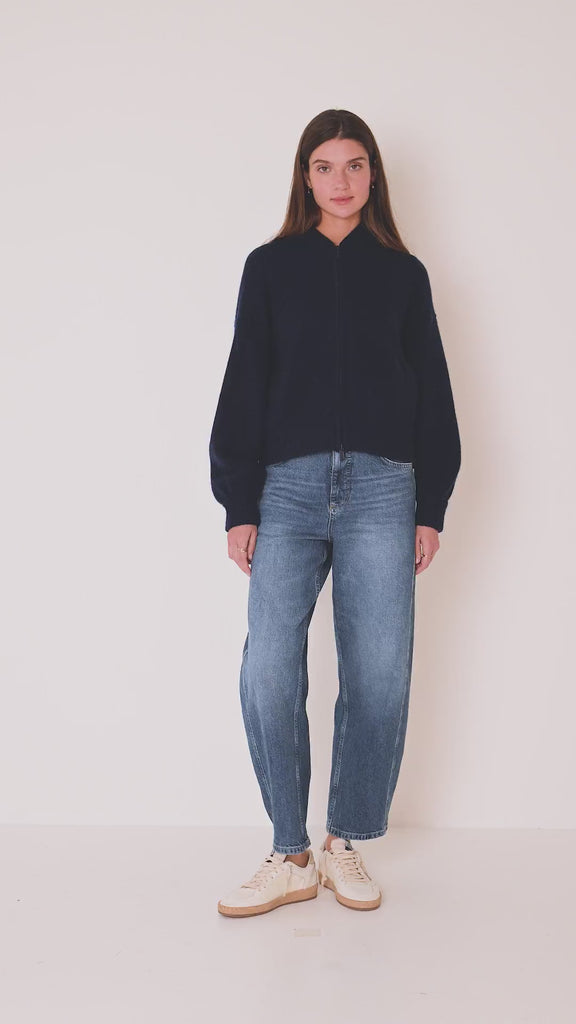 Strickjacke aus 100% Kaschmir mit Stehkragen und langen Ärmeln mit überschnittenen Schultern. Zwei Eingrifftaschen. Zweiseitiger Zipper. Rippungen am Ausschnitt, Bündchen und Saum.