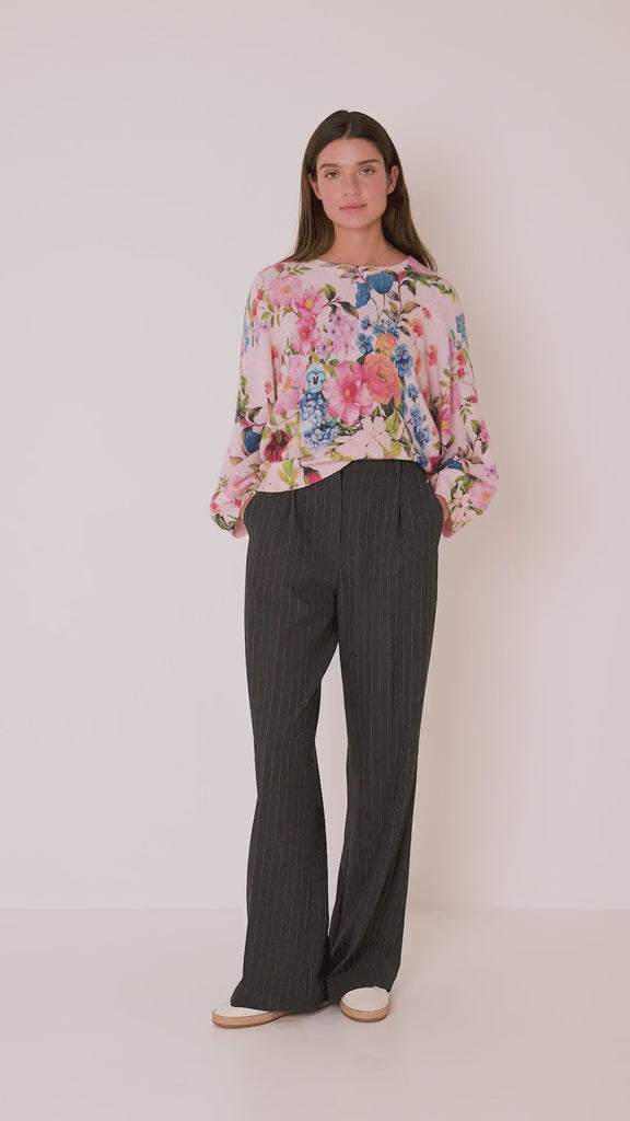Strickpullover aus Wollmix mit Rundhalsausschnitt und langen Ballonärmeln. Allover Blumen-Print. Rippungen am Ausschnitt, Bündchen und Saum.