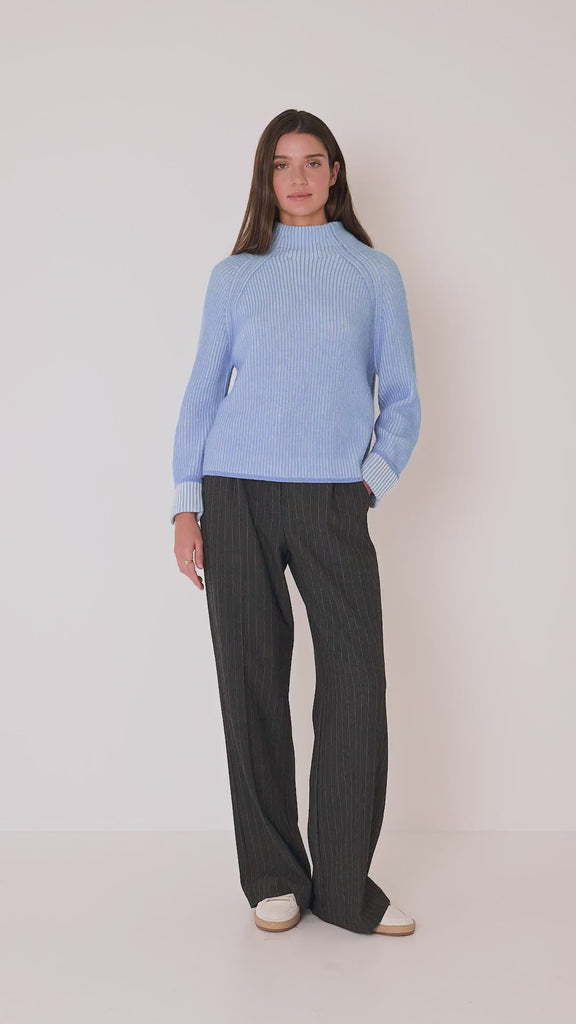 Rippstrickpullover aus Wolle-Kaschmir-Mix mit Stehkragen und langen Raglanärmeln mit Umschlag.